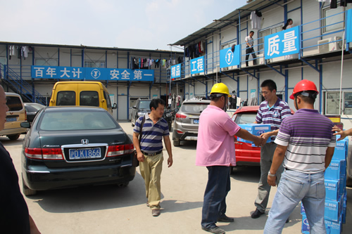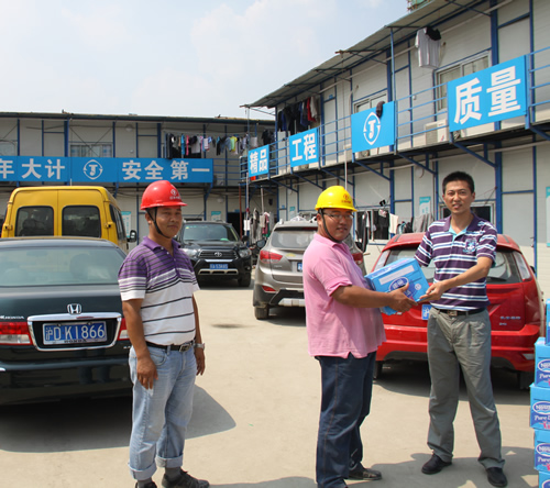 為一線員工送清涼 時間:2013-07-29 5072 驕陽似火,熱浪滾滾,持續近一個月的高溫天氣給工程正常施工帶來了很大的影響,奮戰在烈日炎炎下的一線員工的身體狀況時刻牽動著公司領導的心。7月29日,上海室外溫度更是超過40度,江蘇華建副總經理、上海分公司總經理楊杰特地委托總工程師魏春明、工會副主席陳德權等同志赴由公司承建的上海楓葉國際學校工地看望一線作業人員,為員工送去了礦泉水、毛巾等清涼慰問品,并叮囑要注意避開高溫作業時段,保護身體,確保夏季施工生產安全。
