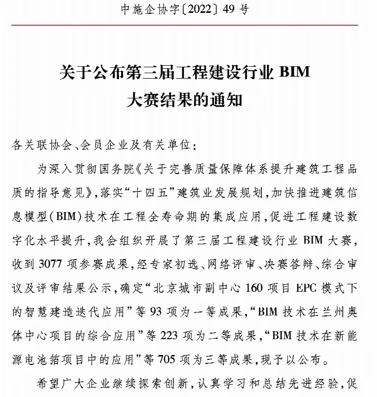 公司中海望京府項目施工階段BIM綜合應用成果榮獲國家級BIM大賽三等獎