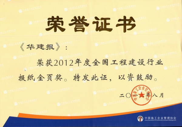 89日,中施企協發布《關于表彰2012年度全國工程建設行業金頁報刊和銀頁報刊的決定》,公司主辦的《華建報》連續第三年被評為全國工程建設行業金頁報刊。《華建報》創刊五年來,積極發揮窗口作用、平臺作用,以反映公司在技術創新、管理創新、體制創新和市場開拓等方面的新動態、新經驗和新成果為主要內容,在宣傳企業形象、凝聚員工精神、塑造企業文化和促進行業交流等方面起到了積極顯著作用,受到社會各界好評。