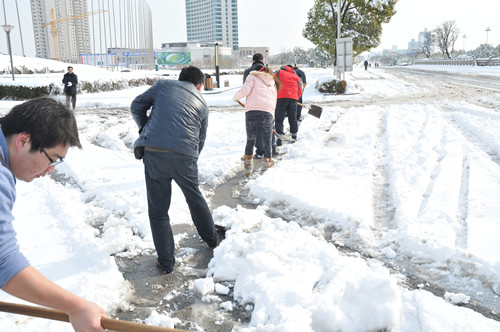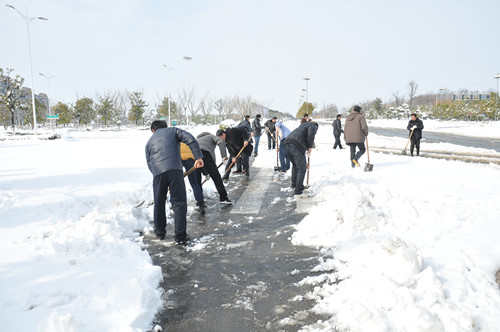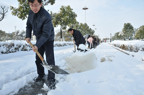 公司總部組織員工上路清掃積雪 時間:2013-02-19 4382 2月18日至19日凌晨,揚州出現低溫降雪災害天氣,降下了多年罕見的一場大雪,壓垮樹枝和部分房屋設施,并造成道路交通不便。19日清晨,公司響應市政府號召,組織20余名員工上路清掃積雪,公司領導吳士茂、錢啟明親自參加,與大家共同會戰2個多小時,完成了清掃任務。 厚重的積雪壓垮樹枝