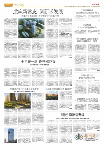 13日《揚州日報》刊發“揚州建工”專版 時間:2015-02-15 3748 2月13日《揚州日報》C3整版刊發“揚州建工”專版,主要包括《適應新常態 創新求發展——建工控股系統2014年逆市奮進再創新佳績》、《華建地產著力打造本土高尚樓盤》、江蘇華建再獲“全國建筑業先進企業”稱號等內容,歡迎關注當日《揚州日報》或網站http://www.yznews.com.cn/yzrb/html/2015-02/13/node_199.htm。