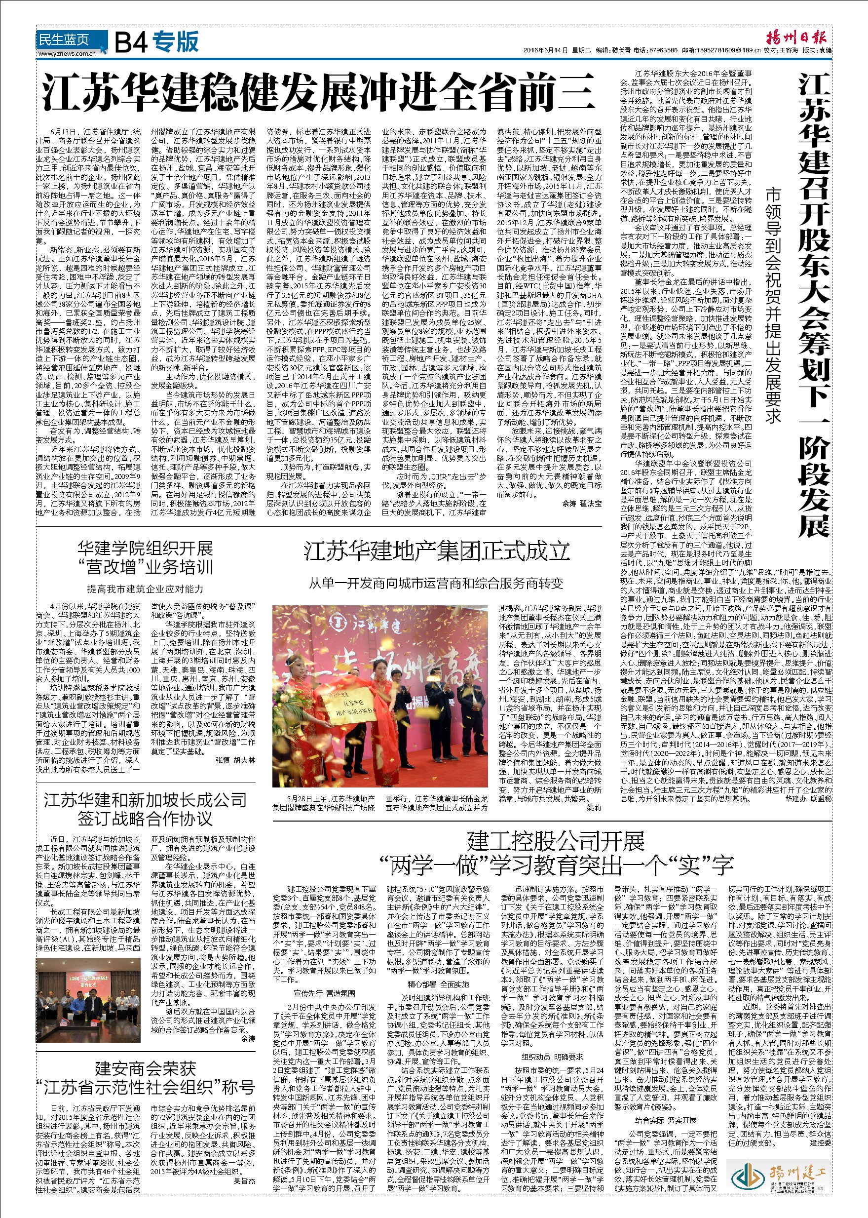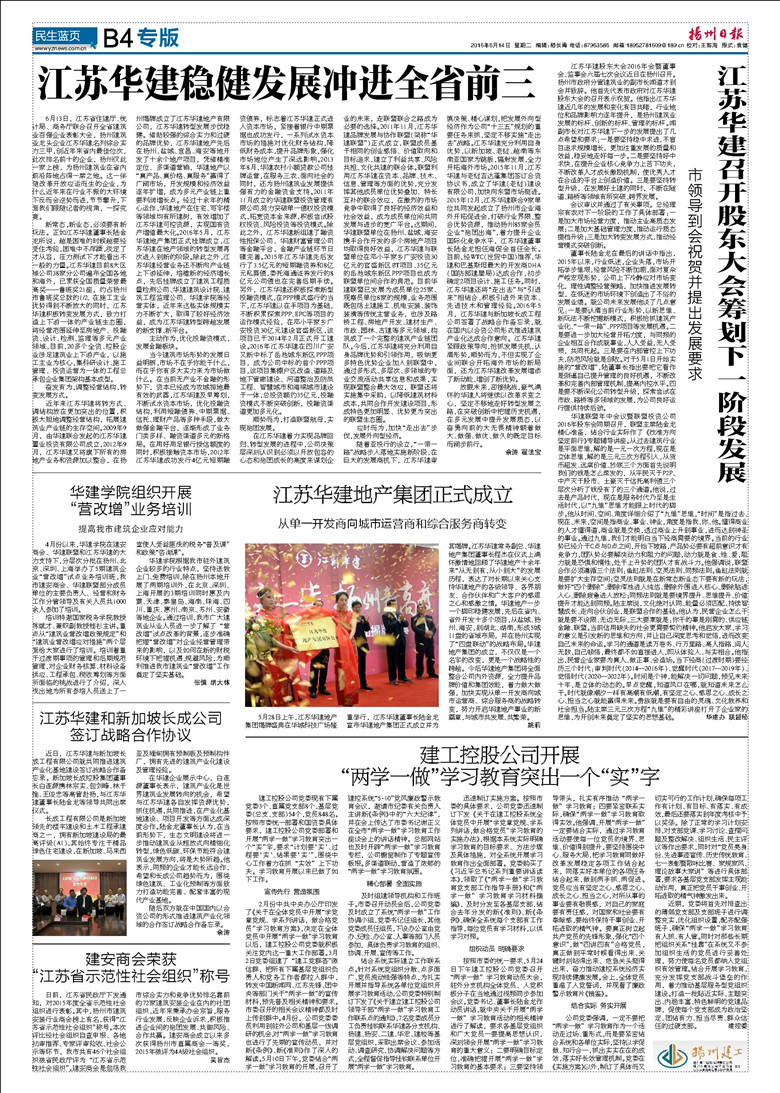 今日《揚州日報》刊登專版文章報道華建進入全省前三有關消息 時間:2016-06-14 4483 今天出版的《揚州日報》B4“揚州建工”專版刊登了江蘇華建穩健發展沖進全省前三、華建股東大會、華建地產集團成立、“兩學一做”學習教育等相關文章,歡迎關注。