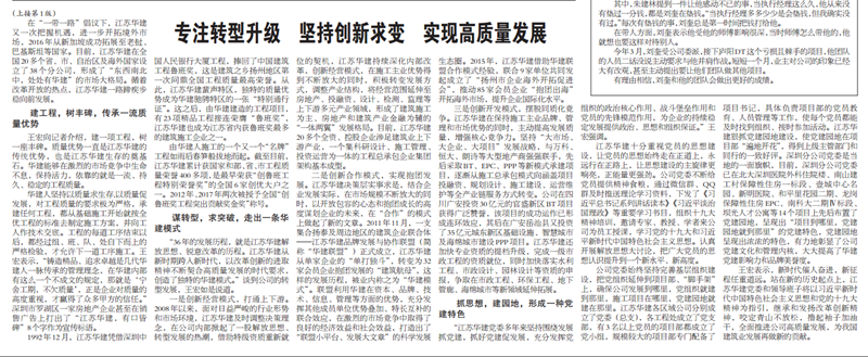 王宏董事長接受《建筑時報》專訪:專注轉型升級,堅持創新求變,實現高質量發展 時間:2018-09-11 4321 9月10日,《建筑時報》頭版及微信公眾號對王宏董事長的專訪給予了刊載。 王宏董事長在專訪中就江蘇華建成立36年來,是如何在改革開放的時代大背景下,走出一條具有華建特色的高質量發展之路,跨入新時代,江蘇華建又是如何以改革創新的進取精神不斷轉型升級,契合高質量發展的時代要求,創造出獨特的華建模式進行了詳細介紹。