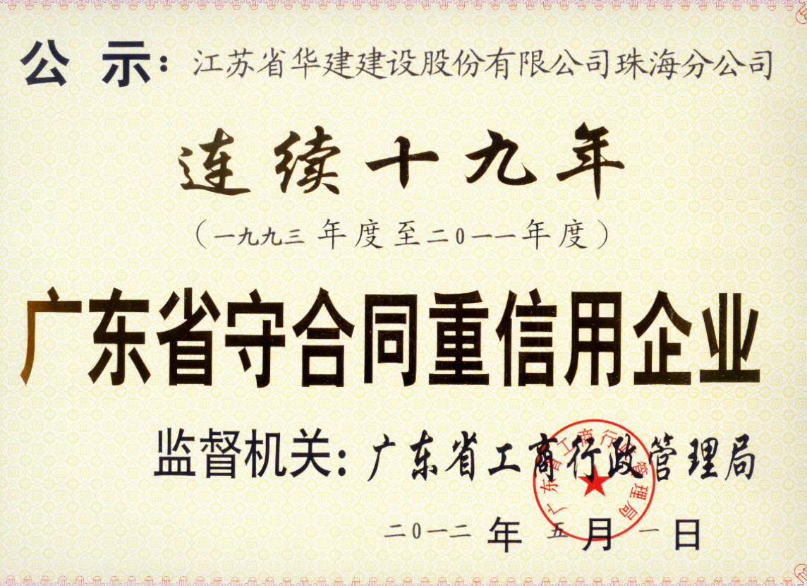 珠海公司連續19年榮獲“廣東省守合同重信用企業”榮譽稱號 時間:2012-06-28 6103 珠海公司連續19年榮獲“廣東省 守合同重信用企業”榮譽稱號 五月份珠海分公司被廣東省工商行政管理局授予“連續十九年廣東省守合同重信用企業”榮譽稱號。