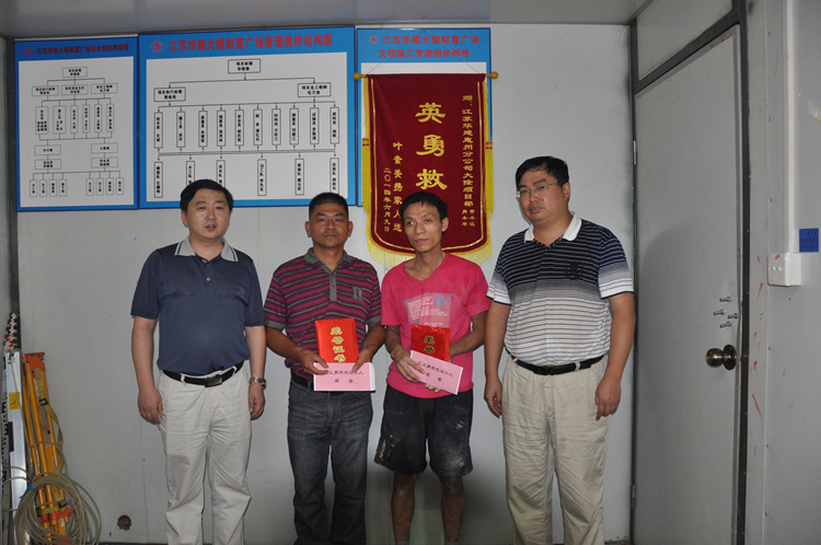 會上,惠州公司副總經理、總工程師龐文榮、分工會主席王健代表分公司經理室和工會向肖小平、黃小江兩位同志發放“見義勇為先進個人”證書,向大隆財富廣場項目部發放“見義勇為先進集體”證書,并給予一定數額的現金獎勵。同時號召大家向兩位同志學習,學習他們舍己救人的崇高精神,學習他們樂于助人的高尚品德,為樹立公司良好精神面貌、傳遞社會正能量做出新的貢獻。