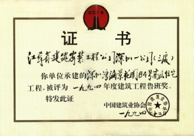 本工程在施工中能精心組織,通過QC小組活動,嚴格把關工程9個分部全部優良。在1993年的深圳市優質樣板評選中名列第一,同時榮獲1994年江蘇省金牌獎和1994年建設部部優獎,1994年建筑工程魯班獎。