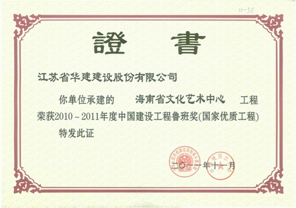 海南省文化藝術(shù)中心(海南省歌舞劇院)是海南省委、省政府在“十一五規(guī)劃” 期間實(shí)施的重點(diǎn)惠民公共文化設(shè)施,是海南文藝繁榮發(fā)展的新座標(biāo)。坐落于海南文化公園中軸線上,工程建筑面積23500平方米,東西長(zhǎng)128米,南北寬113米,高33米,包括可同時(shí)容納1300人的劇場(chǎng)、演出輔助用房、排練房等建筑,建筑造型酷似一只展翅飛翔的大鳥。工程總造價(jià)1.94億元。先后獲得2009年度國(guó)家AAA級(jí)安全文明標(biāo)準(zhǔn)化誠(chéng)信工地、全國(guó)優(yōu)秀質(zhì)量管理小組稱號(hào)及全國(guó)質(zhì)量信得過班組稱號(hào)等多項(xiàng)榮譽(yù)。通過技術(shù)創(chuàng)新,獲得省級(jí)工法兩項(xiàng)、省級(jí)QC成果兩項(xiàng)、省級(jí)優(yōu)秀技術(shù)論文三篇,被評(píng)為海南省新技術(shù)應(yīng)用示范工程。2011年11月,榮獲2010-2011年度中國(guó)建設(shè)工程魯班獎(jiǎng)(國(guó)家優(yōu)質(zhì)工程),是公司獲得的第16個(gè)“魯班獎(jiǎng)”項(xiàng)目。