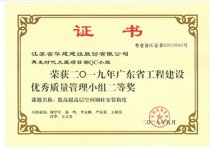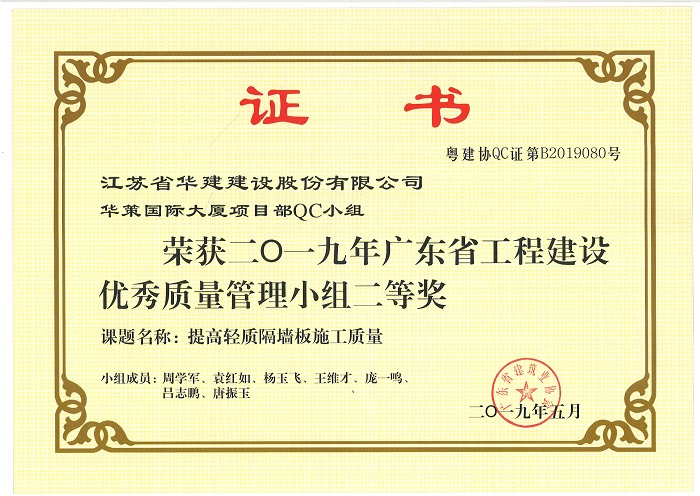 公司新添4項省級工程建設優秀QC成果 時間:2019-07-11 4031 近期,廣東省建筑業協會發文公布了2019年度廣東省工程建設優秀質量管理小組名單,公司華策國際大廈項目部QC小組“提高輕質隔墻板施工質量”、再生時代項目部QC小組“提高超高層空間鋼柱安裝精度”兩項成果喜獲二等獎,華策國際大廈項目部QC小組“提高鋼結構工程高強螺栓安裝合格率”榮獲三等獎。 華策國際大廈項目部QC小組“設備機房減振降噪的創新方法”成果在江蘇省建筑業協會組織的2019年度江蘇省工程建設質量管理小組活動中榮獲二等獎。